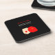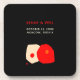 Este suporte de plástico rígido editável apresenta em sua parte inferior, duas formas florais unidas em vermelho e amarelado que representam o amor natural, o casal e o casamento. As seguintes palavras estão escritas: nomes do casal, data e local do casamento. O fundo é preto.