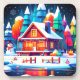 O brilho sutil das pequenas luzes à volta da janela acentua a confortável satisfação da casa de madeira, enquanto o boneco de neve se posiciona alegremente no portão, exalando calor no ar, simbolizando a alegria e felicidade da estação.