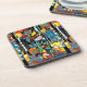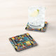 Um gato branco com aparência geométrica, de vidro manchado se encontra em uma floresta vibrante de pássaros. O fundo apresenta uma mistura colorida de folhas de outono e tons de azul e amarelo. Photoshop de arte digital