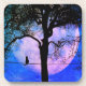Lua de cheio fantástica de matizes roxos e céus azuis cobaltos com um gato preto a olhar para ele