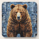 Arte vibrante que retrata um urso com um casaco de pelo rico e texturizado, colocado contra um fundo de retalhos com tons azuis e cinzas. O urso permanece imponente e realista, capturando a atenção com suas características realistas.