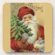 Um Papai noel do Velho Mundo está segurando uma árvore de Natal e brinquedos para crianças. Saudação: Feliz Natal. Imagem de um Cartão de Saudação de Natais vintages em um fundo ouro personalizado.