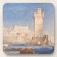 Rodes. Joseph Mallord William Turner (1775 - 1851). Uma paisagem agradável em tons rosas e azuis. No primeiro plano estão barcos e naves na baía perto das paredes da cidade. no meio, há uma torre alta. Ao fundo há uma cidade com casas de pedra. Reprodução de famosas imagens de arte no dominio público.