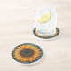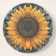 Uma representação artística de um girassol grande com pétalas detalhadas sobre um fundo escuro decorativo cheio de folhas.