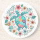 Porta-copos Boho Turquoise Floral Sea Turtle - Coastal Round