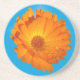 Calendário. Uma cabeça de flor Solteiro com gotas de orvalho nas pétalas laranja, fundo azul.