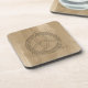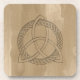 Uma porta copos de cortiça com um simples triquetra celta entrelaçada com um círculo formando um símbolo trinitário ancorado sobre um fundo de madeira, representando a unidade espiritual com o divino.