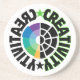 Esta imagem apresenta um logotipo circular com a palavra "CRIATIVIDADE" escrita em letras negras a negrito ao redor do perímetro. A palavra é espelhada, com a "CRIATIVIDADE" aparecendo tanto no sentido dos ponteiros do relógio como no sentido anti-horário. Dentro o círculo, um design preto e branco que se assemelha a um alvo ou a uma roda preenche o espaço. À esquerda da roda, há um gráfico circular colorido com segmentos em roxo, azul, azul claro, verde e amarelo. Duas estrelas, uma verde e uma preta, são colocadas no topo e no fundo da roda, respectivamente. A design sugere uma conexão entre criatividade e poder das ideias. As letras negras e as cores contrastantes criam um forte impacto visual, enfatizando a importância da criatividade.