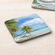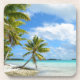 Porta copos com uma palmeira de suspensão em uma praia branca da areia de uma ilha tropical no Oceano Pacífico que pertence ao arquipélago Polinésia francesa de Tahiti.