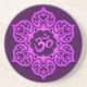 Um Aum ou um OM projetam sentam-se dentro de uma flor de lótus estilizado. O teste padrão circular é colorido com uma violeta profunda que seja destacada para criar um brilho claro na superfície. O fundo é o roxo escuro pintado que pode ser considerado através do espaço negativo da flor. Uma sombra aparece apenas abaixo do design que faz o parece flutuar apenas acima da superfície da porta copos. Este design à moda é uma representação impressionante deste símbolo espiritual.