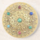 Porta copos de arenito redondo de um medalhão de ouro com jade, safira azul, rubi e outras pedras semipreciosas não identificadas. Veja toda a coleção de Portas copos Gemstones & Medallions na seção HOME.