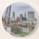 Skyline do Cleveland, Ohio em um dia nublado com o rio de Cuyahoga que funciona abaixo