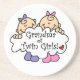 Dois bebês adoráveis num dorminhoco cor-de-rosa e lavanda e texto que diz "Vovó das Gêmeas" na nova vovó das raparigas gêmeas guardam caixas, azulejos, ornamentos, canecas, ímanes, cartões, autocolantes, sacos de tote e outras roupas e presentes de vovó.