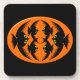 Esta porta copos de cortiça incrível apresenta um oval laranja com seis corvos. Cada corvo tem olhos amarelos com pupilas pretas e asas salientes. Os corvos voam em direção uns aos outros formando uma forma oval. O fundo é preto.