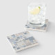 Uma elegante porta copos de pedra com um mosaico moderno inspirado pela praia em azul, cinza e cor bege, com um sutil efeito aquarela.
