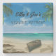 Porta copos personalizada de pedra. Adicione nomes próprios, nome da família, nome da empresa ou qualquer texto à primeira linha de texto que seja negrito, script preto. Abaixo está outra linha para personalizar no estilo de fonte impressa divertida. Água do oceano azul, e céu azul é o fundo com um barco velho na praia e palmeiras próximas.