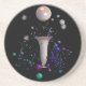 Um objeto central semelhante a trompete rodeado por esferas coloridas e estrias é colocado sobre um fundo preto. O arranjo dá uma sensação de dispersão flutuante ou cósmica.