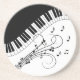 Teclado preto e branco clássico com um estilo curvo. As notas de música acrescentam uma aparência festiva.