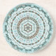 Este círculo concêntrico mandala apresenta camadas de padrões brancos, turquesas e marrons inspirados por ondas celtas e capim indiano, como videiras, fitas e flores de lótus.