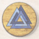 Uma porta copos astuciosa da bebida que caracteriza o design clássico de Valknut sobre o fundo de madeira belamente resistido do protetor de Viking.