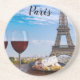 Dois copos de vinho tinto com salgadinhos com vista a Paris e à torre Eiffel. Vidro de vinho tinto com diferentes aperitivos - prato com presunto, fatiado, queijo azul. Casal, celebração romântica. Café com vista.