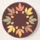 Folhas amarelas, laranja, marrom e verdes dispostas em círculo.