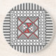 Esse quadrado concêntrico apresenta padrões geométricos simples em tons de cinza e vermelho com as cores nas camadas alternadas ao passar da vertical para a horizontal.