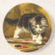 Porta copos Sandstone com a pintura a óleo de Henriëtte Ronner-Knip The Young Artist (1821-1909). Um gatinho preto e branco brinca com pintura e dois pincéis. Um presente adorável para amantes de gatos e entusiastas do Romantismo.