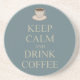 Este produto é feito com o provérbio mantem a calma e bebe o café com um copo de café bonito ao longo da parte superior