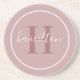 A design de porta copos de bebida personalizada redonda elegante apresenta um monograma clássico personalizado de serifa inicial em rosa empoeirado com o seu sobrenome em um roteiro de caligrafia branca moderno contra um fundo cor-de-rosa claro / rosa poeirento. Um círculo branco simples enquadra o design. O esquema de cores pode ser personalizado para se coordenar perfeitamente com o decorador doméstico.