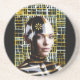 Uma mulher com cabeça careca e pintura corporal futurista listrada de preto e ouro se posiciona diante de um fundo geométrico. Ela tem uma design de flor amarela decorativa na testa.