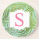 Design de porta copos de estilo tropical apresenta um padrão verde de folha de palma de frondes em camadas com cor azul verde de fundo do mar. Quadro decorativo branco tem uma letra de monograma em rosa claro (pode ser personalizado) que você pode personalizar com a inicial do seu sobrenome.