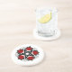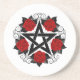 Pentagrama preto com padrão, decorado com floração, rosas vermelhas com folhas em fundo branco. Tatuagem.