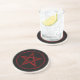Pentagrama vermelho, invertido, texturizado em círculo, sobre fundo preto. Símbolo oculto. 666