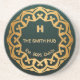 Elevate your home bar with this custom-designed coaster. Featuring an elegant gold mandala border on a deep green background, it is personalized with the initial "H", "THE SMITH HUB", "Est. 2026", and "Dublin". Perfect as a unique housewarming, wedding, or anniversary gift, or as a stylish addition to your own pub. Customize the text to create your own unique version.
