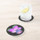 Esta bonito porta copos de arenito apresenta uma fotografia de uma flor de Pansy selvagem. A foto foi colorida artificialmente, resultando em um pansy com pétalas roxas rosadas e brilhantes com pétalas verdes e um centro azul profundo. O fundo é preto para fazer a flor se destacar.