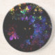 Uma porta copos de arenito personalizada que apresenta um gato fractal preto cercado por folhas coloridas.
