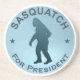 Uma silhueta escura de Sasquatch (Pé Grande) sobre um fundo azul médio, juntamente com o texto em bloco que se lê "SASQUATCH FOR PRESIDENTE". Não está muito entusiasmado com a escolha dos candidatos ao Presidente desta vez? Procurando um forasteiro de Washington? Aqui está o seu candidato. Na verdade, Bigfoot passa quase todo o seu tempo fora em Washington, Idaho, Oregon, vários outros estados; e partes do Canadá. Grande o suficiente para encher qualquer calçado, mas não precisa se preocupar que ele vai arcar com o Congresso para impor uma agenda radical, de esquerda ou de direita, como ele é tão raramente visto. Votem em uma América mais selvagem. Votem Sasquatch! Trazido a você pelo Comitê de Ação Política de Criptozoologia (CPAC); Bonners Ferry, ID