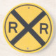 Fotografia de um sinal de passagem de ferrovia laranja e preto.
