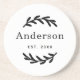 Esta simples e elegante montanha-russa de bebidas monogramas apresenta galhos de louros de folhas que moldam um sobrenome familiar. Um belo presente para recém-casados ou novos donos de casa. As cores design pretas podem ser modificadas para coordenar com o decorador doméstico.