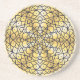 Uma mandala tipo rendas em azul escuro com estrelas azuis brilhantes e douradas e um círculo brilhante de gradiente de explosão solar atrás faz um design divertido que traz à mente um céu noturno e um dia ensolarado com uma imagem.