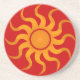 A Porta copos solar 6 por 369Mandala apresenta um sol brilhante contra um fundo vermelho de tom de joia.