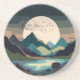 Uma paisagem abstrato de uma enorme superlua em uma cena de lago montanhês com um bando de pássaros em texturas ousadas e tons escuros de marrom, bege, bronzeado, azul, ciano e preto.