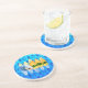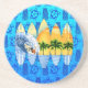 Arte surfando do estilo mural em prancha de lado a lado com um fundo azul e umas tartarugas de mar de Honu e umas máscaras havaianas cor-de-rosa de Tiki.