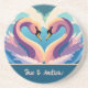 Esta design de porta copos personalizável apresenta um casal cisne de pé cabeça a cabeça enquanto forma um coração sobre nuvens mágicas. Esta é uma design perfeita para um presente romântico de Dia de os namorados! Você pode personalizar os nomes dos casais!