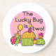 O inseto sortudo é dois! T-shirts de segundo aniversário de Cupcake, fatos-calças, cartões, autocolantes, botões de aniversário, ímanes, sacos de tote e outros segundos aniversários com cupcakes de aniversário coloridos, uma vela de aniversário, um balão e joias de sorte!