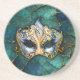Uma bela máscara veneziana ornamentado apresenta ouro intrincado e designs prateados acentuados com joias azuis. O fundo apresenta um padrão rachado de tons profundos e tons azuis.