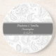 Esta porta copos dada forma redonda do arenito da bebida tem um teste padrão cinzento e branco de paisley com um lugar para o seu adicionar os nomes dos noivos junto com a data dos nuptuals.