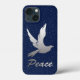 Capa de telefone numa pomba e palavra paz num gradiente de efeito metálico prateado, num fundo azul esfomeado