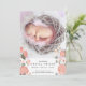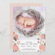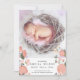Anuncie a chegada de sua menina com nosso doce anúncio de nascimento floral apresentando sua foto adornada com flores, botões e verde roxos. Personalize com o nome do bebê, estatísticas de natalidade e seus nomes.